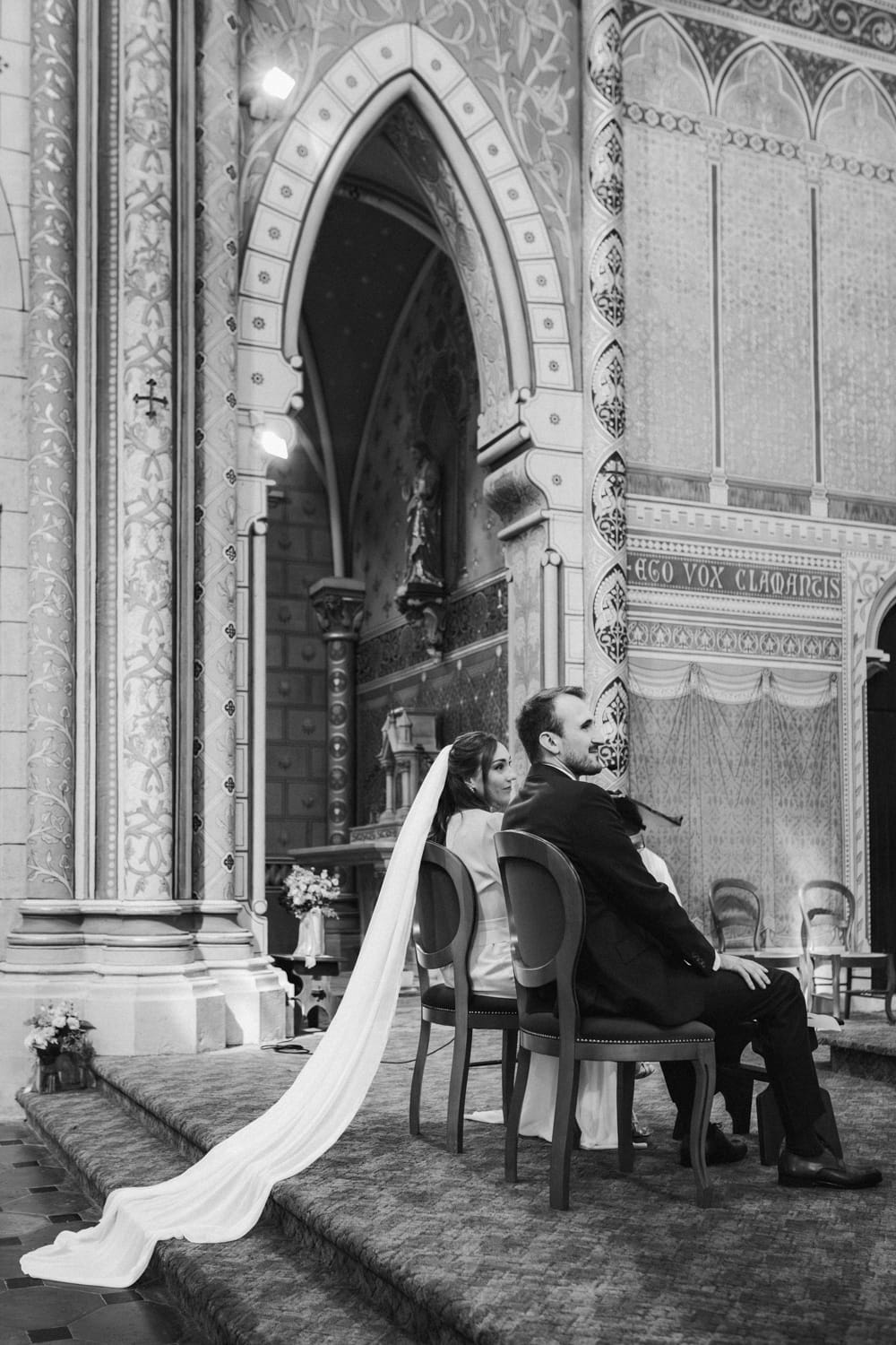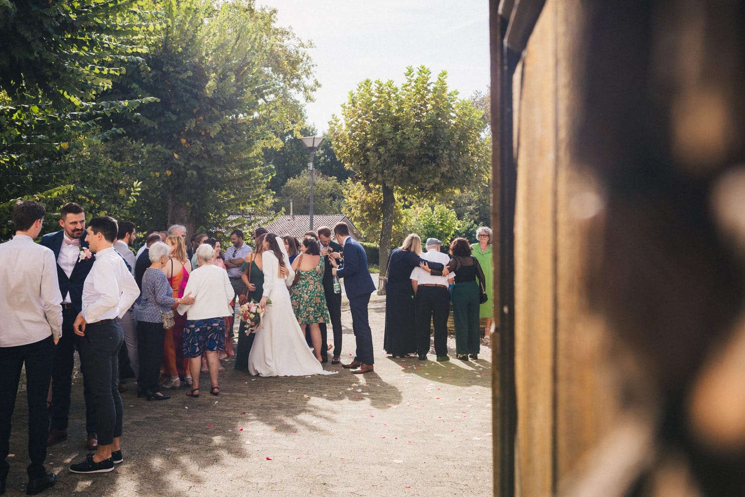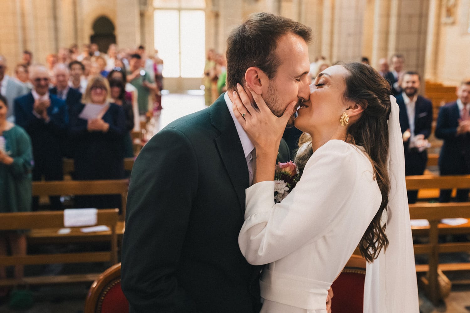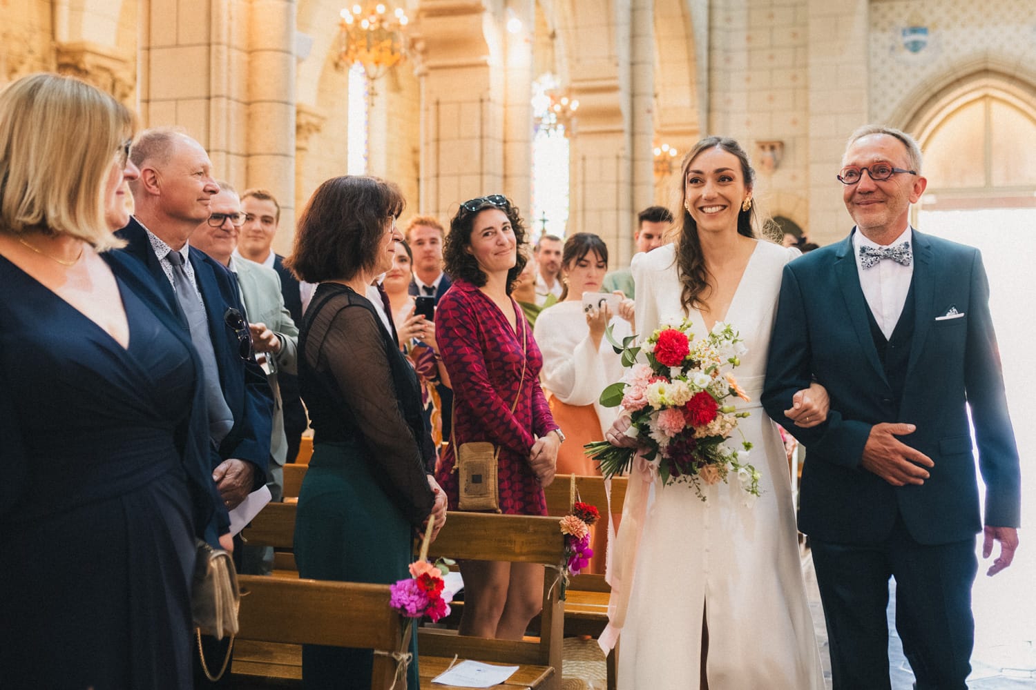 La bénédiction a lieu dans la belle église colorée de Benquet, à quelques kilomètres de là. Julien découvre Coline qui remonte l’allée au bras de son père. La cérémonie, traditionnelle, se déroule sans encombre et les deux amoureux se disent oui devant leurs familles et leurs amis. Puis ils sortent de l’église sous les applaudissements de leurs invités et quelques pétales de rose fusent dans les airs.
