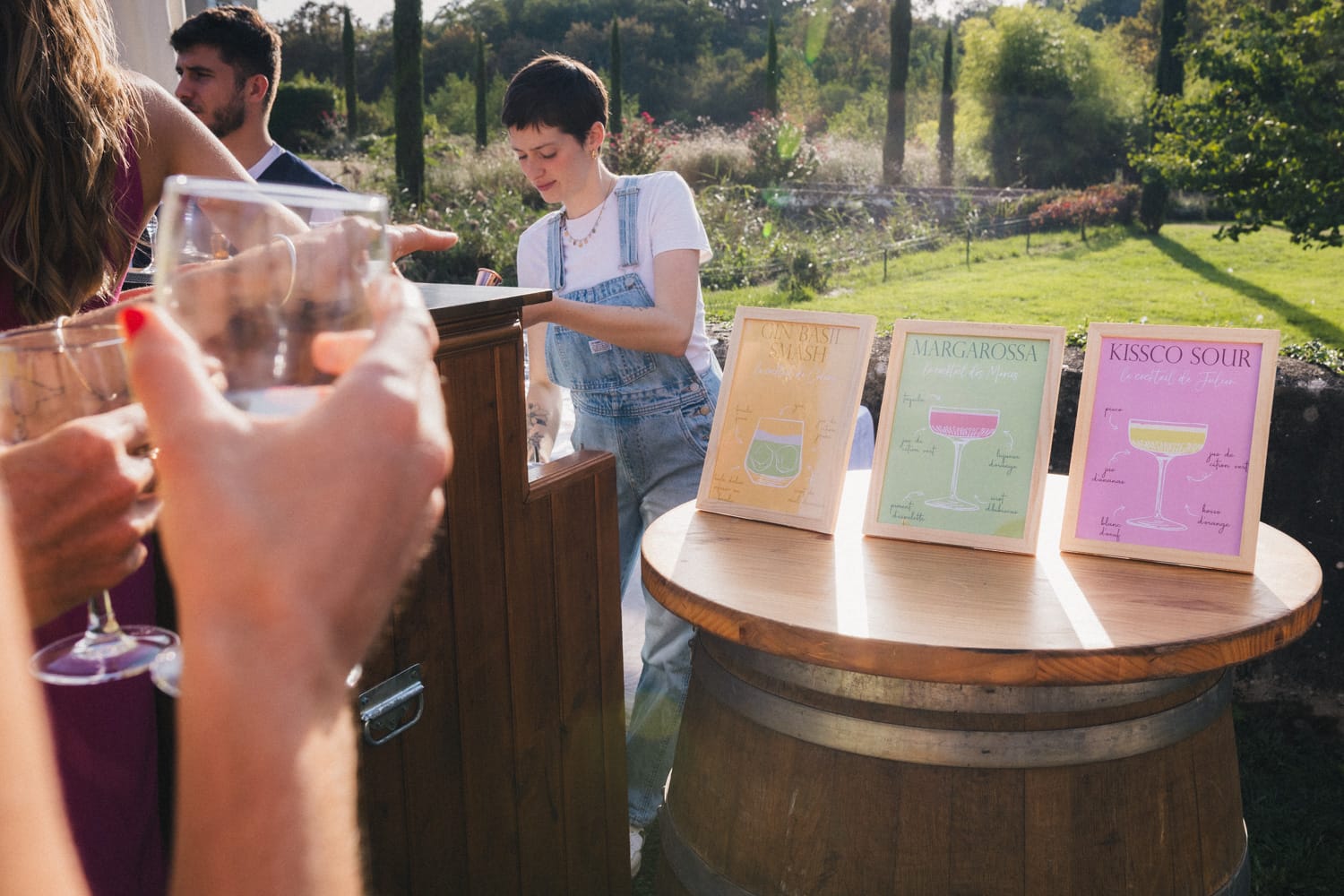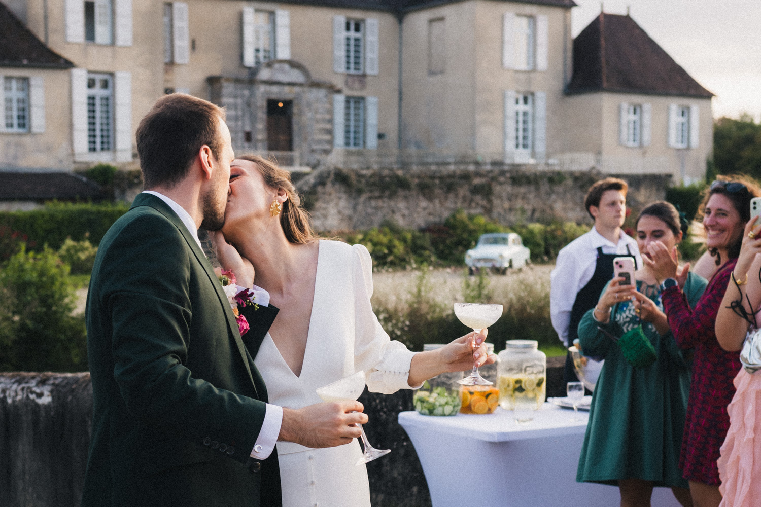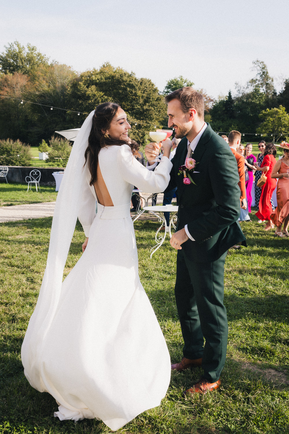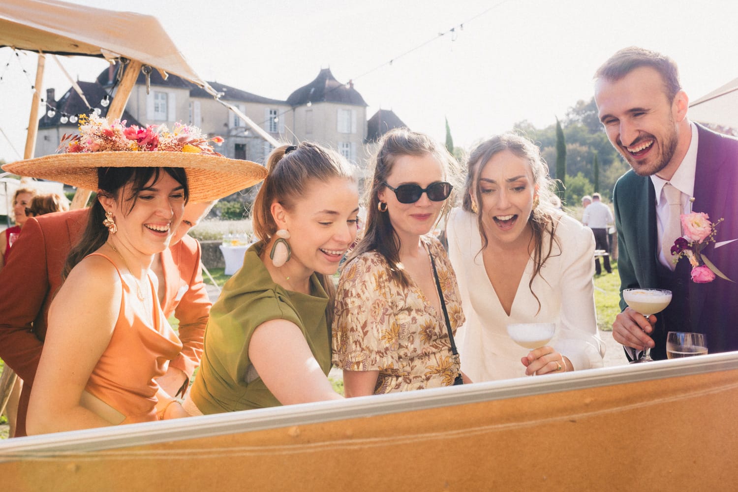 De retour au château de Campet pour faire la fête, et après quelques photos de groupe, Coline et Julien ouvrent le vin d’honneur en trinquant avec leurs verres de cocktail. Car ils se sont fait un petit plaisir en faisant intervenir sur leur mariage Hugo et Joana, alias HUG Cocktail : un adorable duo qui prépare des cocktails délicieux pour vos vins d’honneur et vos soirées ! (spoiler : les invités ont tellement aimé qu’ils ont dévalisé leur stock)