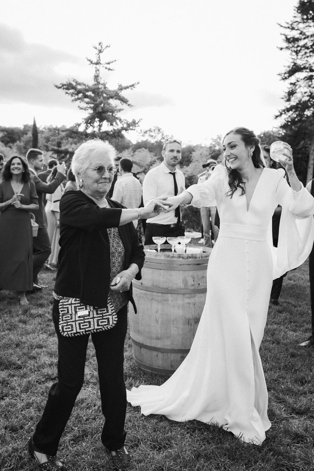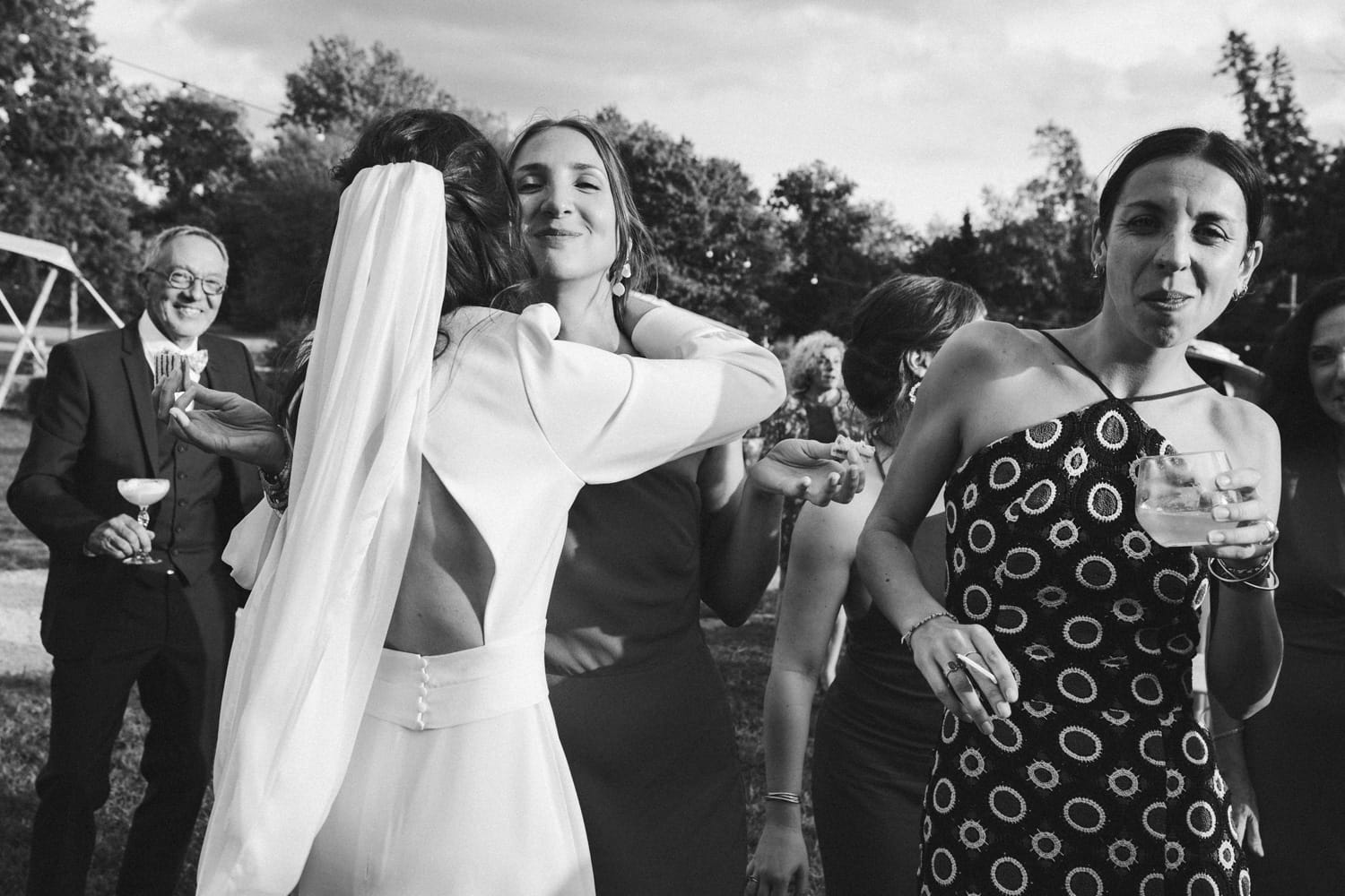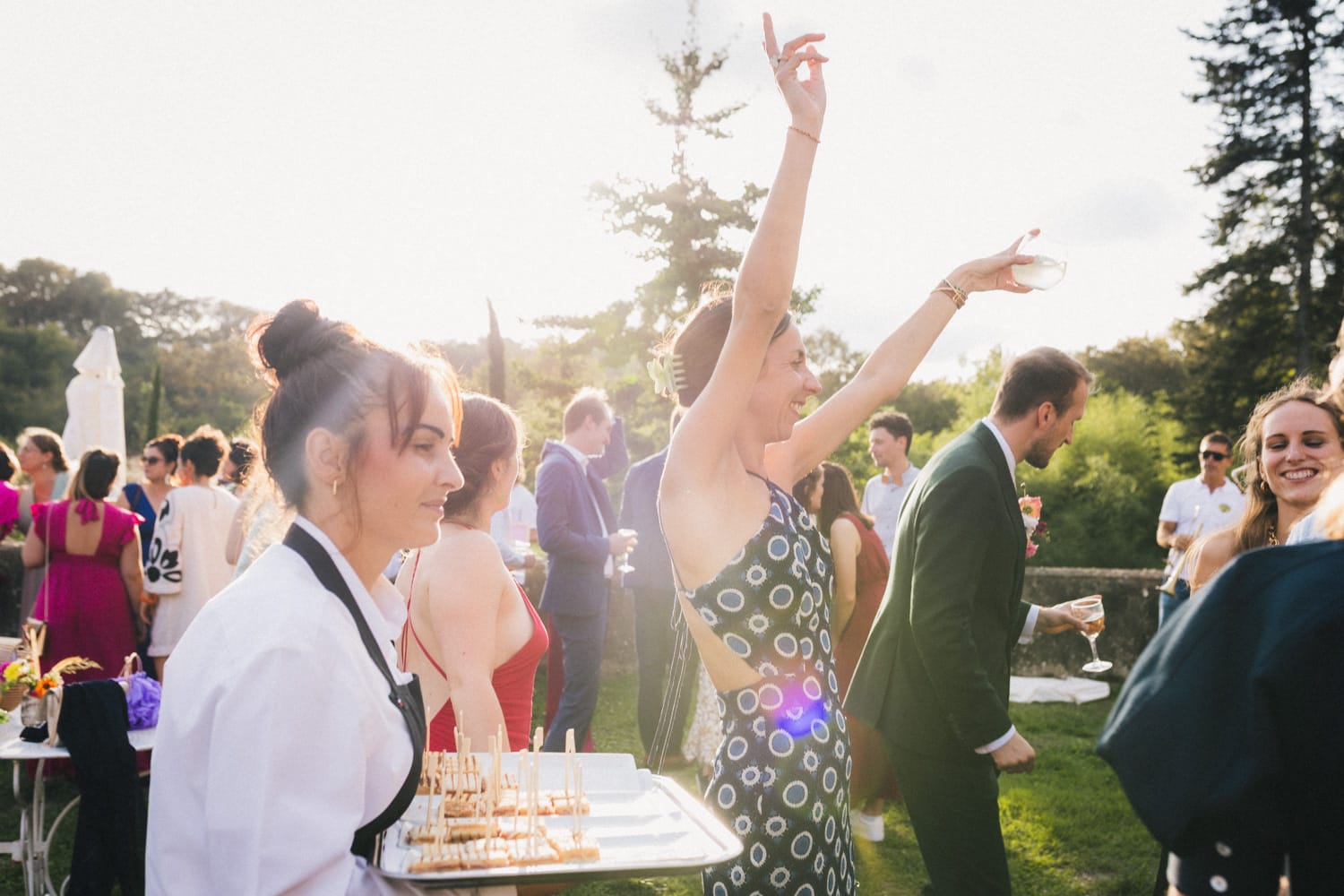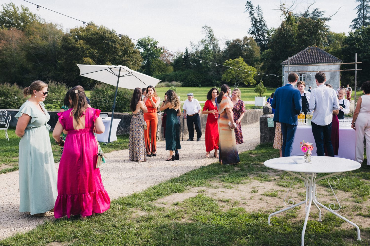 De retour au château de Campet pour faire la fête, et après quelques photos de groupe, Coline et Julien ouvrent le vin d’honneur en trinquant avec leurs verres de cocktail. Car ils se sont fait un petit plaisir en faisant intervenir sur leur mariage Hugo et Joana, alias HUG Cocktail : un adorable duo qui prépare des cocktails délicieux pour vos vins d’honneur et vos soirées ! (spoiler : les invités ont tellement aimé qu’ils ont dévalisé leur stock)