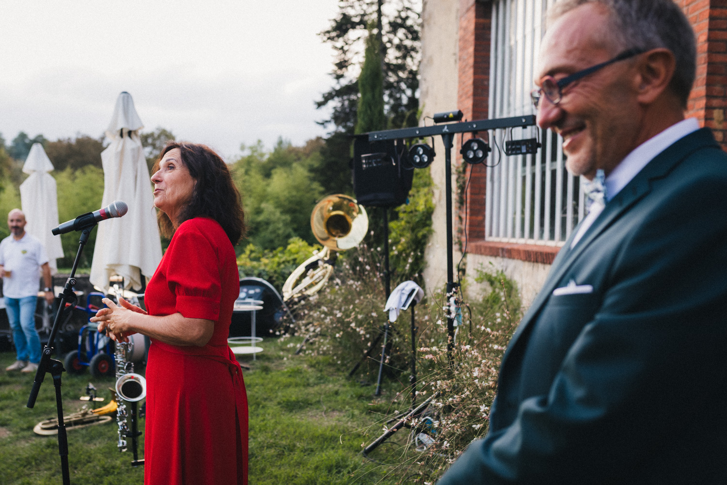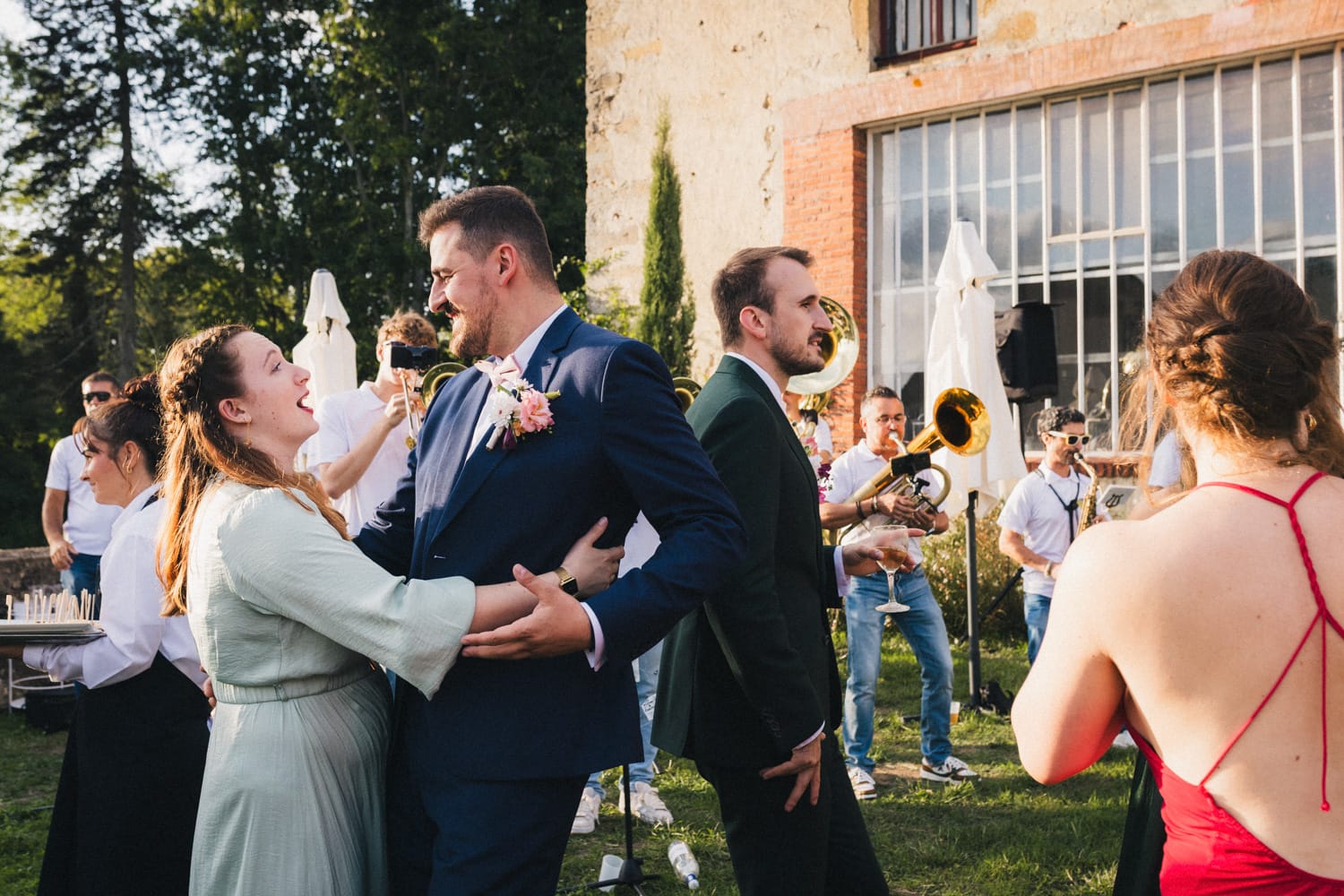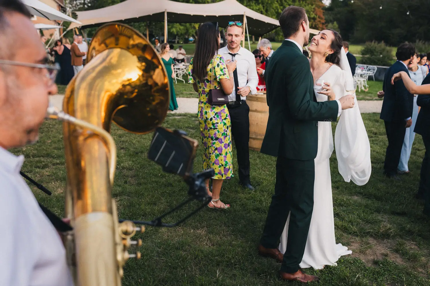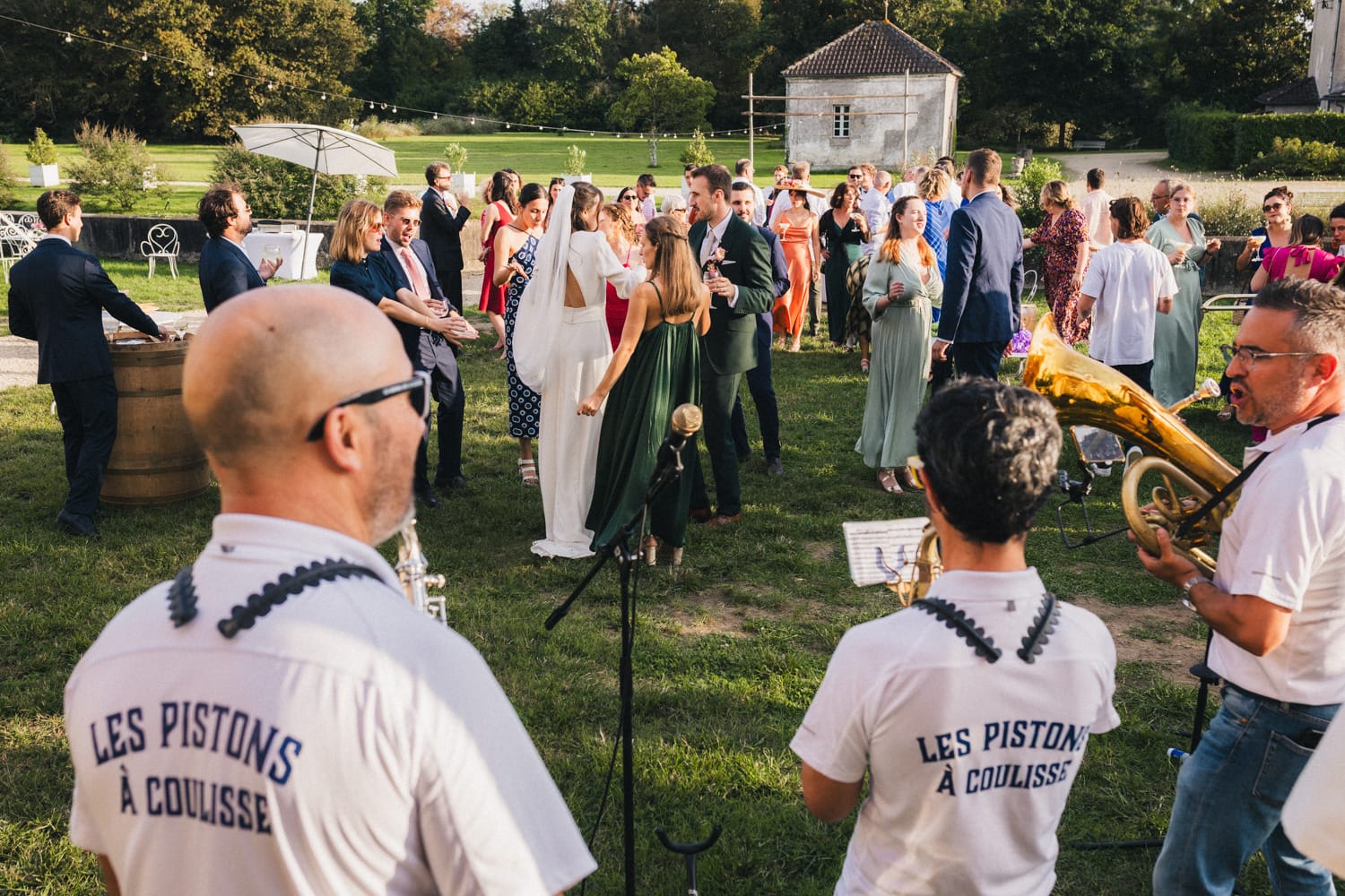 Les heures passent, les invités profitent des derniers rayons du soleil, dégustent les pièces cocktail en discutant – et parfois en dansant ! Car les Pistons à coulisse sont là pour mettre l’ambiance, et il ne faut effectivement pas trop longtemps pour embraser la piste. Le soleil n’est pas couché que les invités dansent déjà comme s’ils étaient tard dans la nuit, pour mon plus grand plaisir ! Ensuite, les parents des mariés prennent tour à tour la parole pour parler de Coline et Julien. Leurs discours sont à la fois drôles et émouvants. Ils ont d’ailleurs réussi à tirer quelques larmes à nos mariés et à leurs invités !