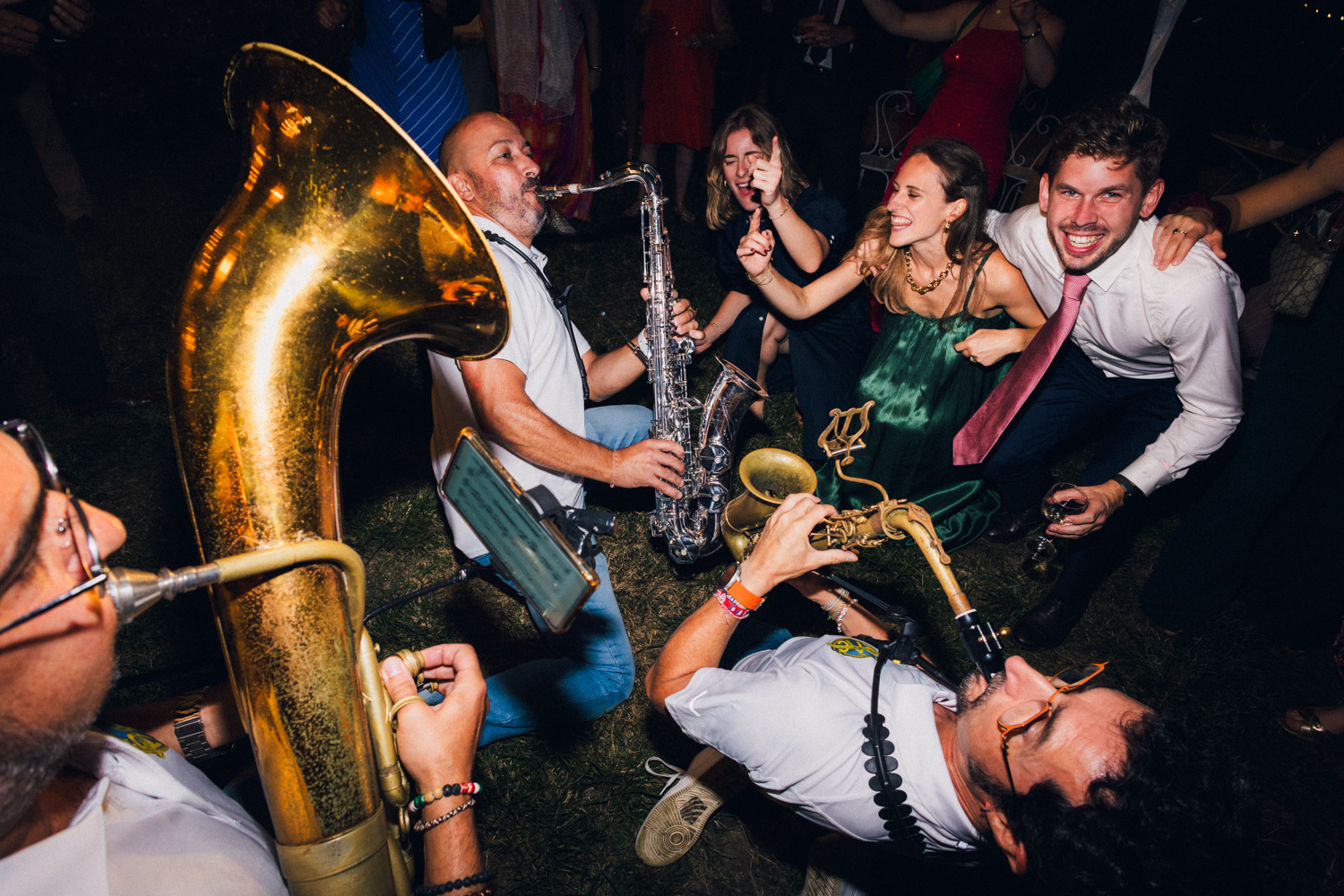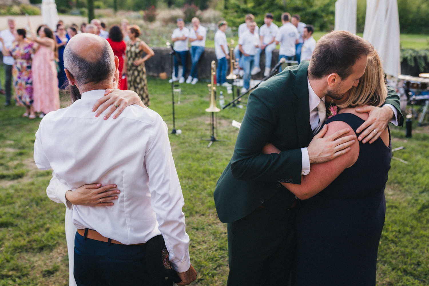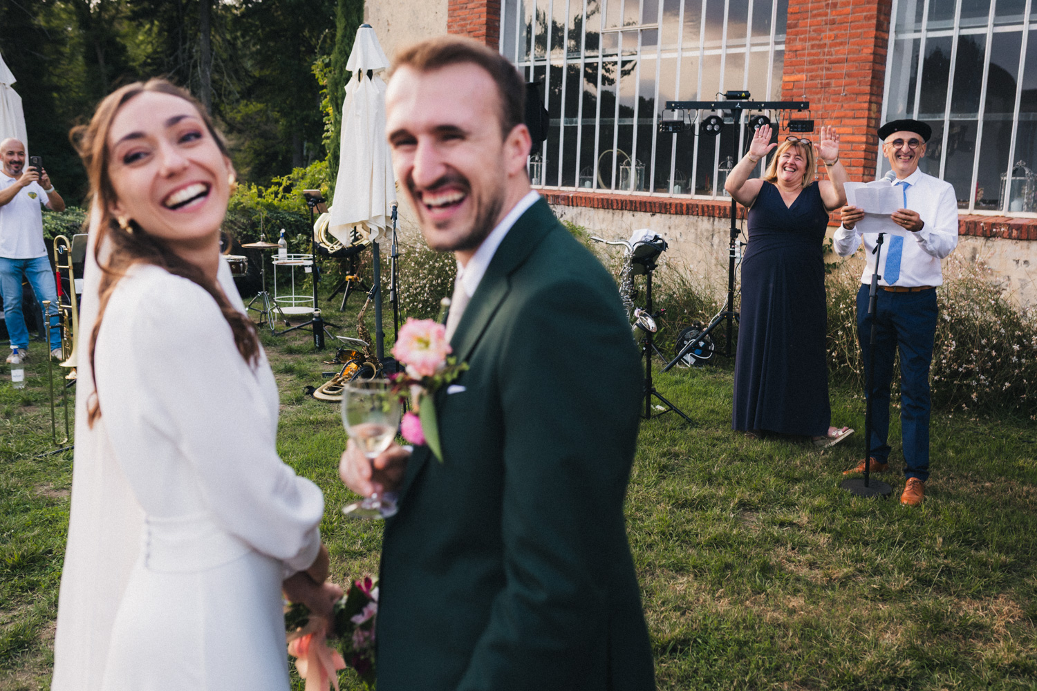 Les heures passent, les invités profitent des derniers rayons du soleil, dégustent les pièces cocktail en discutant – et parfois en dansant ! Car les Pistons à coulisse sont là pour mettre l’ambiance, et il ne faut effectivement pas trop longtemps pour embraser la piste. Le soleil n’est pas couché que les invités dansent déjà comme s’ils étaient tard dans la nuit, pour mon plus grand plaisir ! Ensuite, les parents des mariés prennent tour à tour la parole pour parler de Coline et Julien. Leurs discours sont à la fois drôles et émouvants. Ils ont d’ailleurs réussi à tirer quelques larmes à nos mariés et à leurs invités !