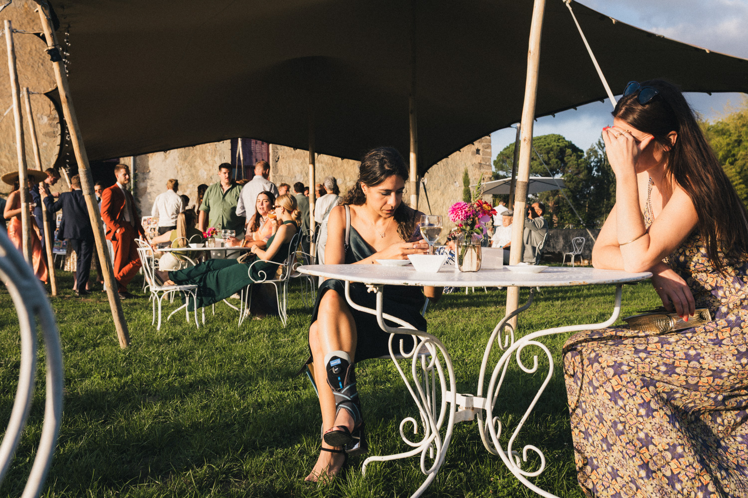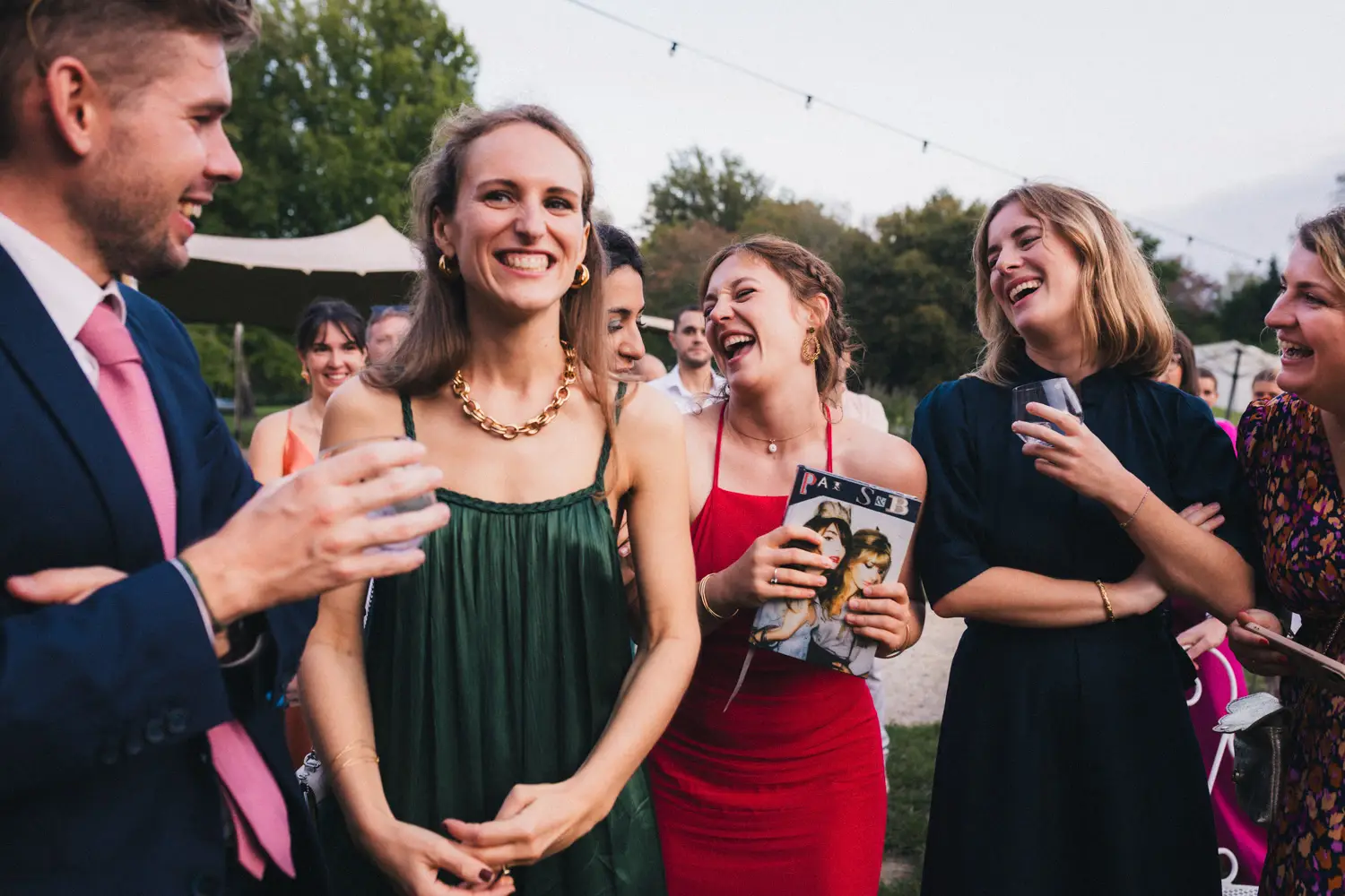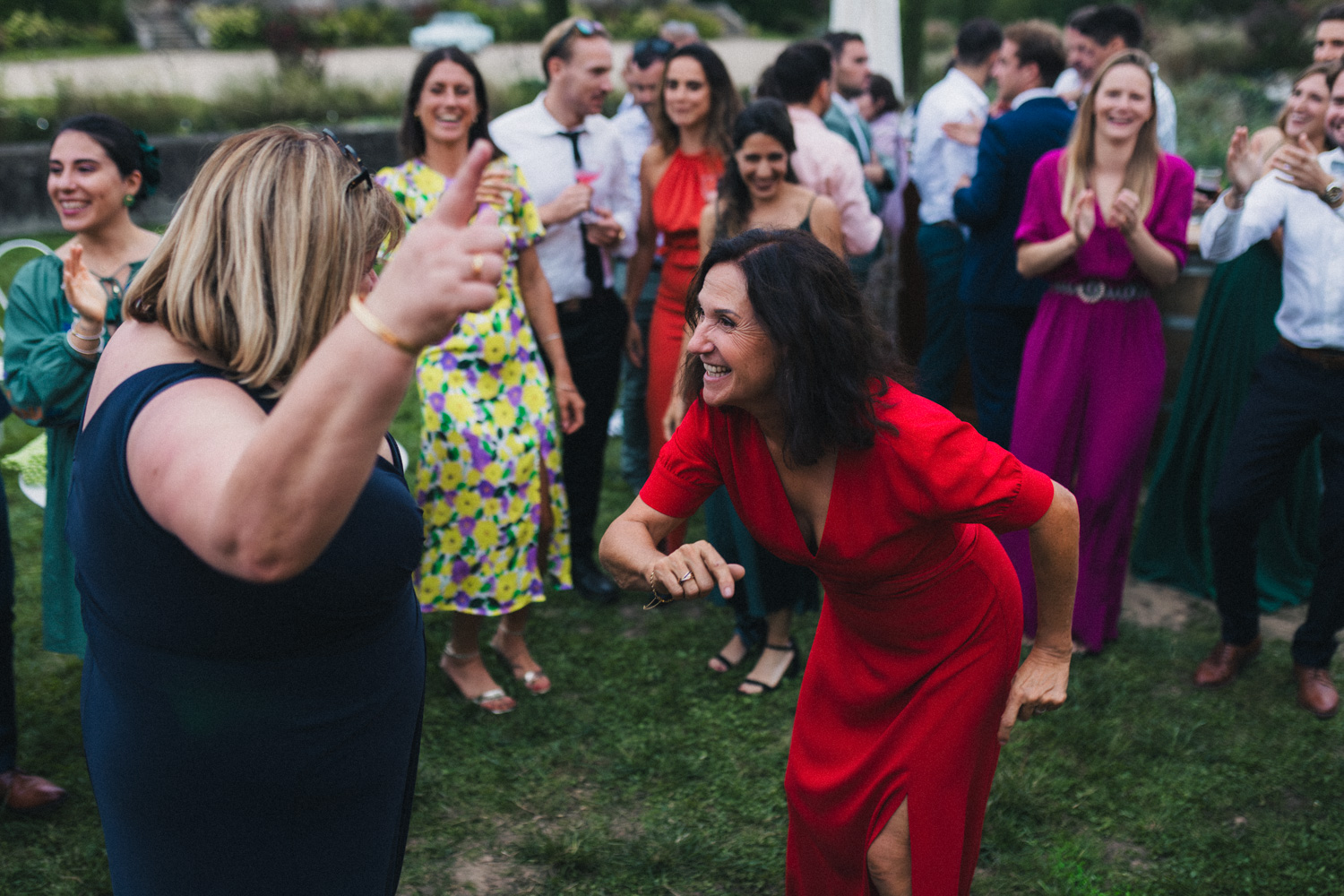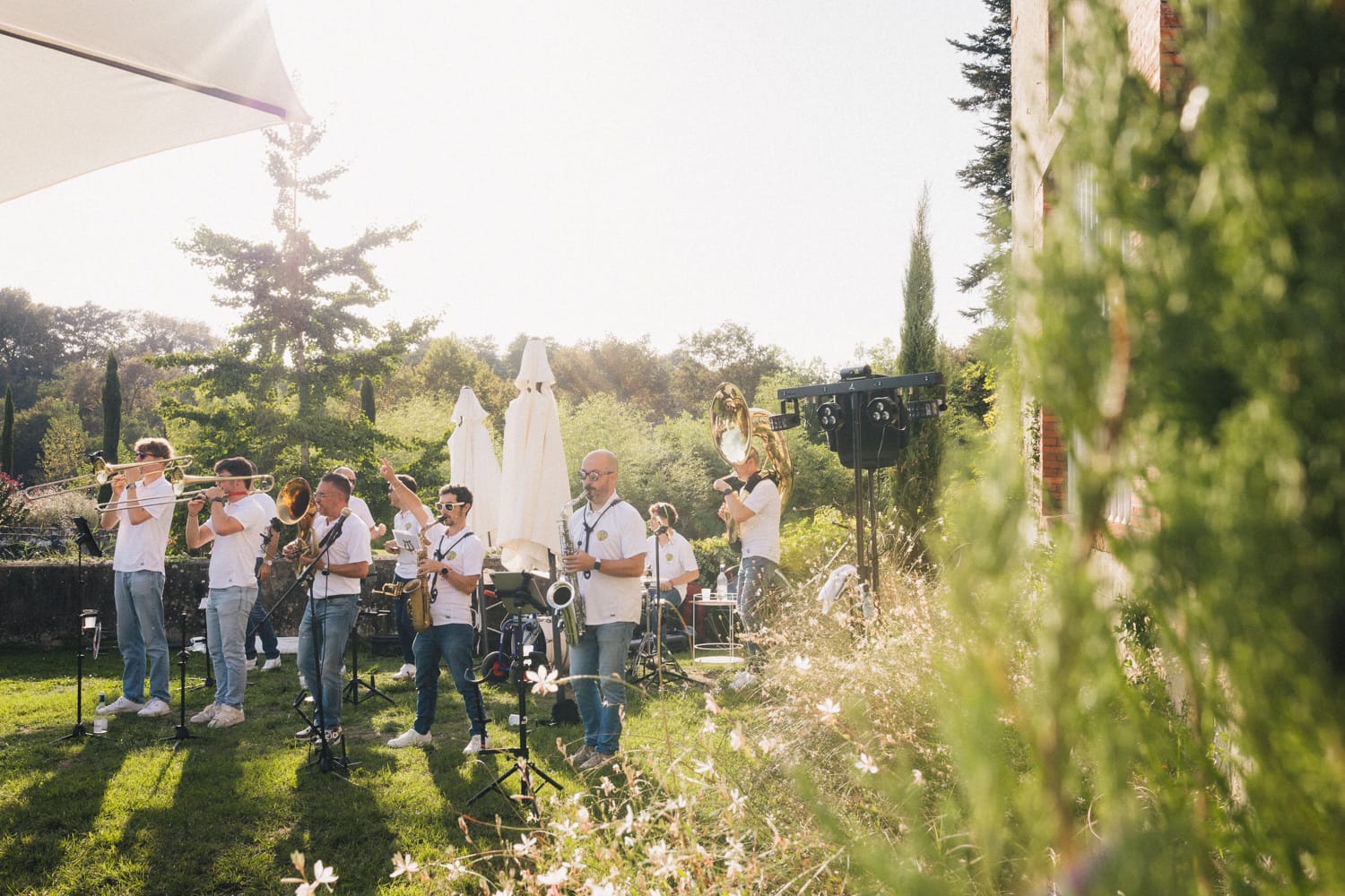 Les heures passent, les invités profitent des derniers rayons du soleil, dégustent les pièces cocktail en discutant – et parfois en dansant ! Car les Pistons à coulisse sont là pour mettre l’ambiance, et il ne faut effectivement pas trop longtemps pour embraser la piste. Le soleil n’est pas couché que les invités dansent déjà comme s’ils étaient tard dans la nuit, pour mon plus grand plaisir ! Ensuite, les parents des mariés prennent tour à tour la parole pour parler de Coline et Julien. Leurs discours sont à la fois drôles et émouvants. Ils ont d’ailleurs réussi à tirer quelques larmes à nos mariés et à leurs invités !