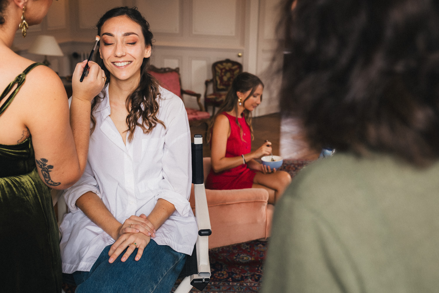 Je découvre pour la première fois le Château de Campet, situé dans le village de Campet-et-Lamolère dans les Landes. Je m’en vais retrouver Coline pour le début de ses préparatifs avec Sarah, dans un des salons du château. La lumière est sublime, la décoration somptueuse. Je sais d’avance que je vais m’éclater photographiquement parlant. Il s’avère que la future mariée est assez stressée, mais elle est heureusement bien entourée, entre ses témoins et sa mère.