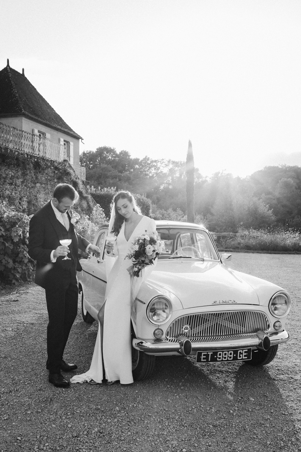 Durant leur séance couple, les mariés trinquent avec leurs verres de cocktail, devant une voiture de collection, dans les derniers rayons du soleil dans les Landes