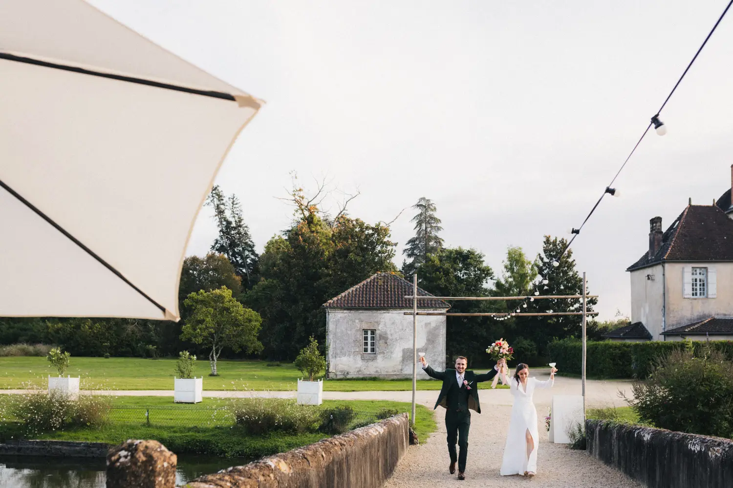 Les mariés avancent main dans la main vers la photographe durant leur séance photo de mariage au château de Campet dans les Landes